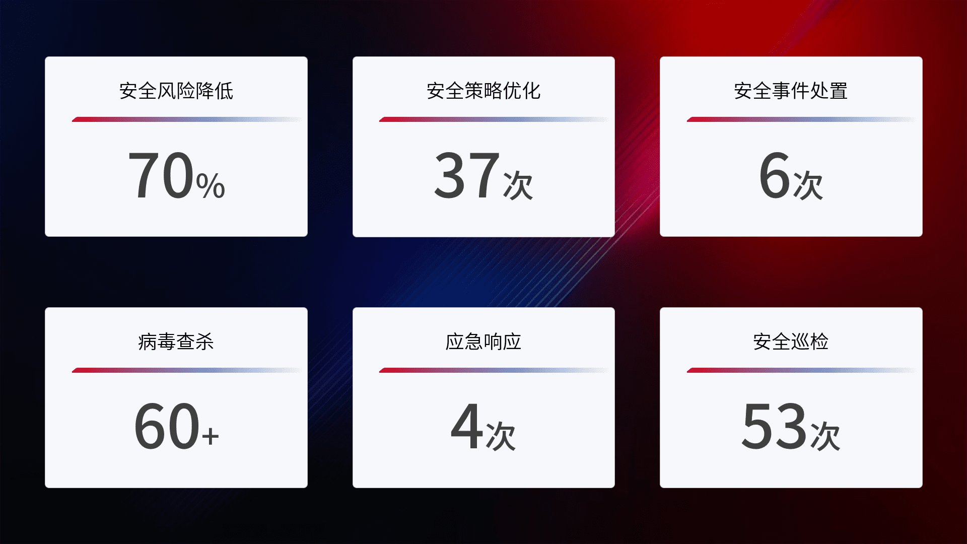提供全面的安全事件报告体系,,,包括处置报告、、、、周报、、、季度和年度总结,,结合持续监控,,,,帮助客户深入了解网络安全状况。。。